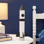 - Shape poster boards into cones and glue them to the top of each rocket. Cut out circles for the rocket windows and triangles for the rocket wings. Then cut a few thin strips for the rockets accent stripes. Glue all cutouts onto the rocket. Allow glue to dry, then blast off!