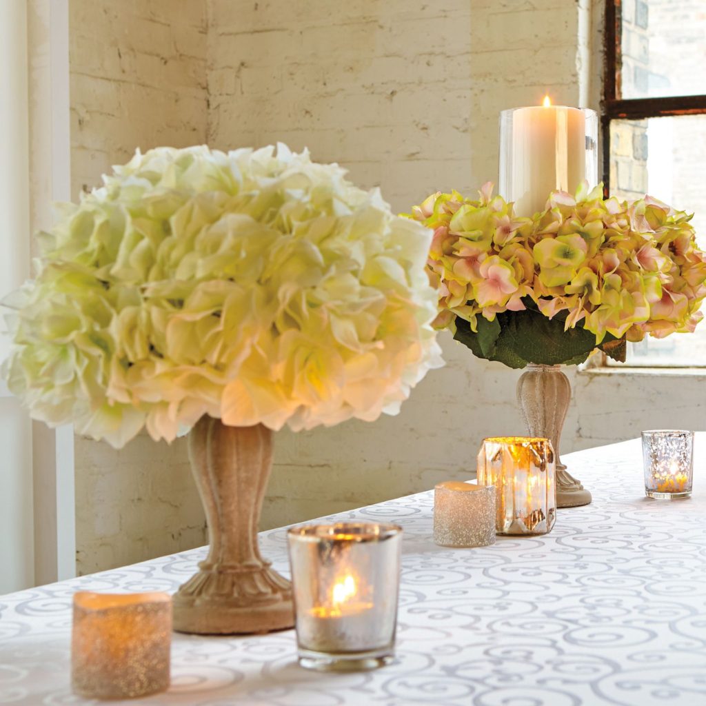 - To create a floral candle ring cut the stems of the hydrangea to about 2”. Apply a small amount of glue to the end of the stem before inserting for added security. Insert the hydrangea around the outside edge of the ball.