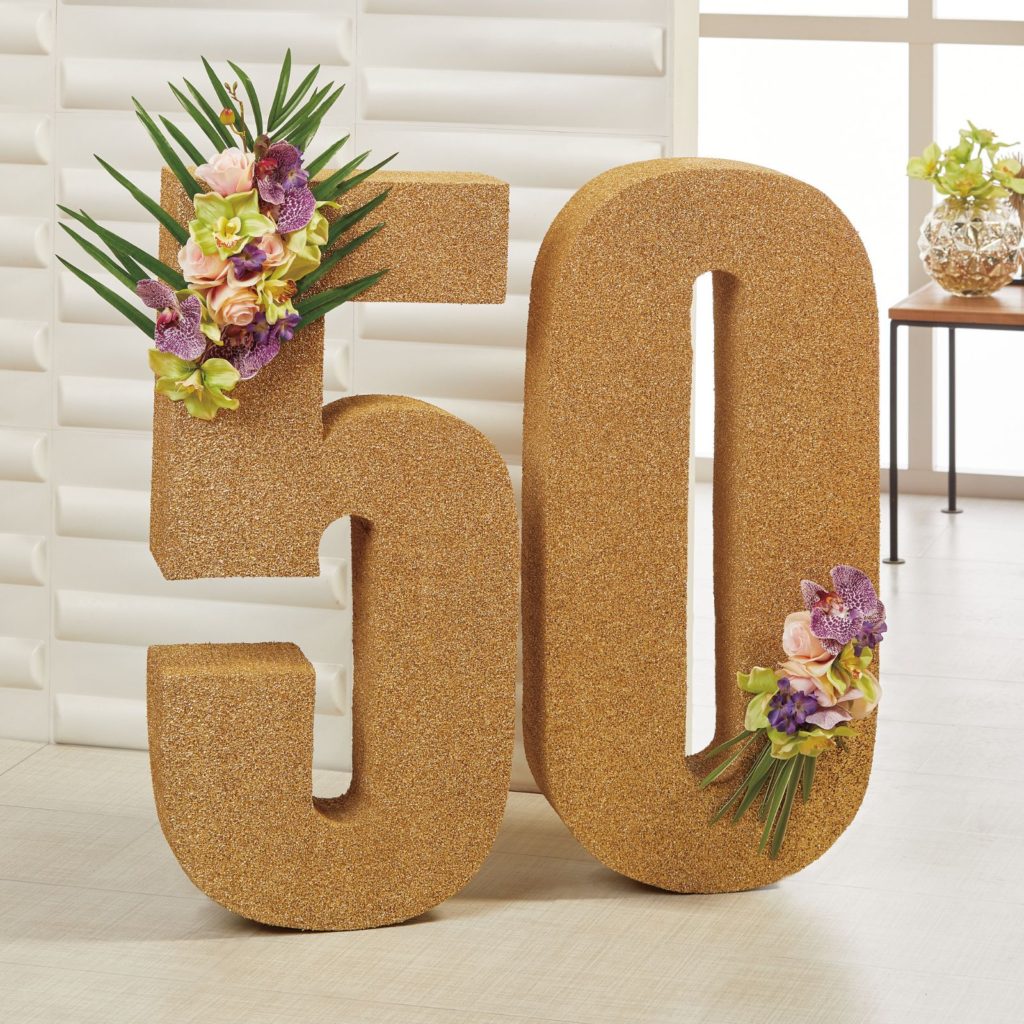 - Determine the desired placement of the flower spots on the foam numbers. To create the larger flower spot at the top left of the number shown, secure a palm leaf to the face of the number using floral pins. Center a large Designer Spot® over the palm leaf and secure it with floral pins. Evenly space orchids into the foam, followed by roses to fill in around the orchids. Repeat this process for a smaller flower spot at the lower right of the numbers, using a small piece of the palm leaf and a small Designer Spot®.