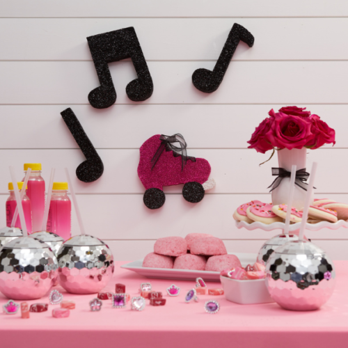 - Paint wood shapes with acrylic paint. Referring to the photo, arrange hearts on the work surface with two dark pink hearts on their straight edges and a light pink heart stacked in between. Hot glue at contact points to make one unit. Set Heart Trio upright and hot glue wood piece under each dark pink heart to make stands. Referring to photo, position, and hot glue flowers to hearts.