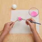 2. Push a toothpick into each ball. Use the toothpick as a handle while you paint. Paint the balls in the desired colors. While the paint is still wet sprinkle the tops of the balls with glitter. As the paint dries it will secure the glitter in place. Push the toothpicks into the scrap piece of foam to dry.