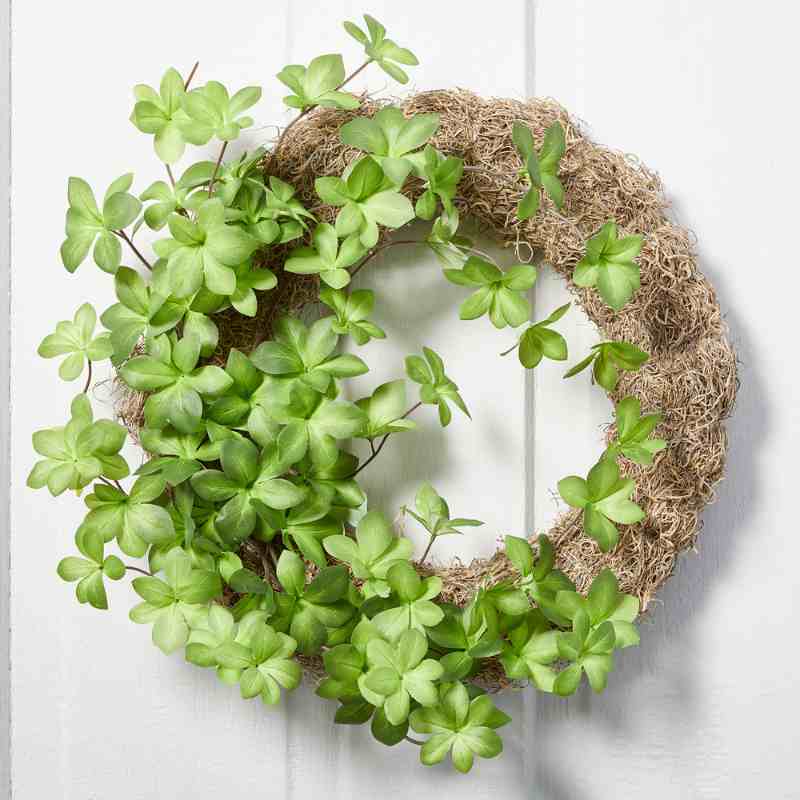 - Cut lengths of ivy and floral pin around the wreath as shown. Add a little glue to the end of the stem before inserting for a more secure hold. You can cover the entire wreath with ivy or leave a little of the moss exposed as shown.