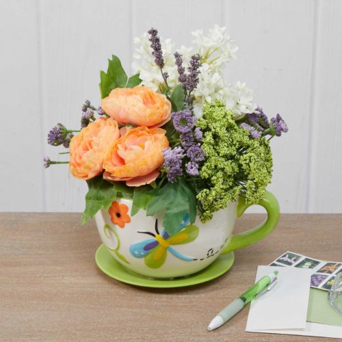 5. Glue fern pieces around the top of the tee pee to conceal the zip tie. Center a flower blossom in the fern, glue in the center for a focal point.