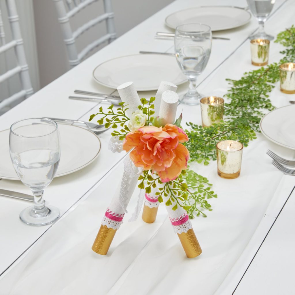 3. Wrap a 1” lace ribbon around each rod where the gold and white sections meet. Layer a pink ribbon over the lace ribbons and glue in place.