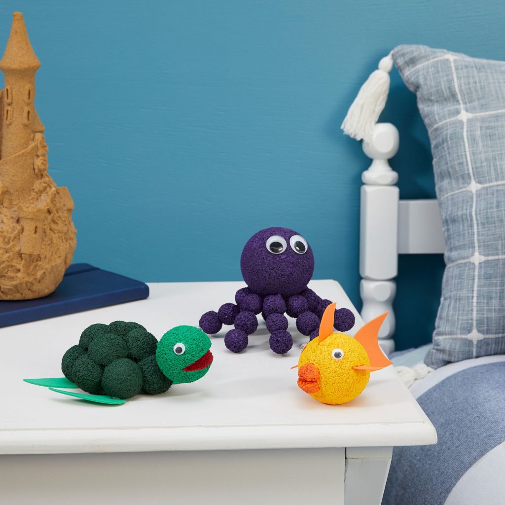 - To finish your sea creatures, make a fish! Paint a ball in your favorite fishy color. Cut fins and a tail from craft foam and then glue them in place. Slice a small foam ball in hal, shape it into a mouth, paint it, and glue it on. Add some wiggle eyes just above the mouth for a finishing touch.